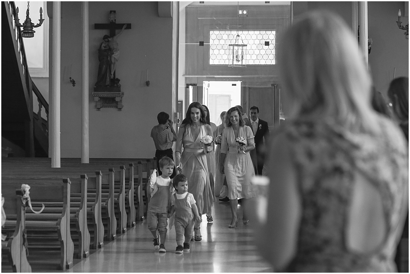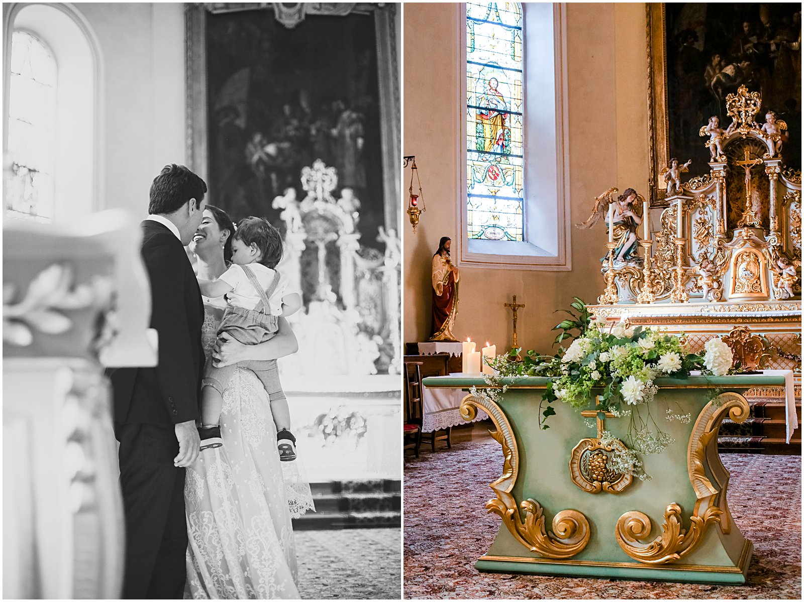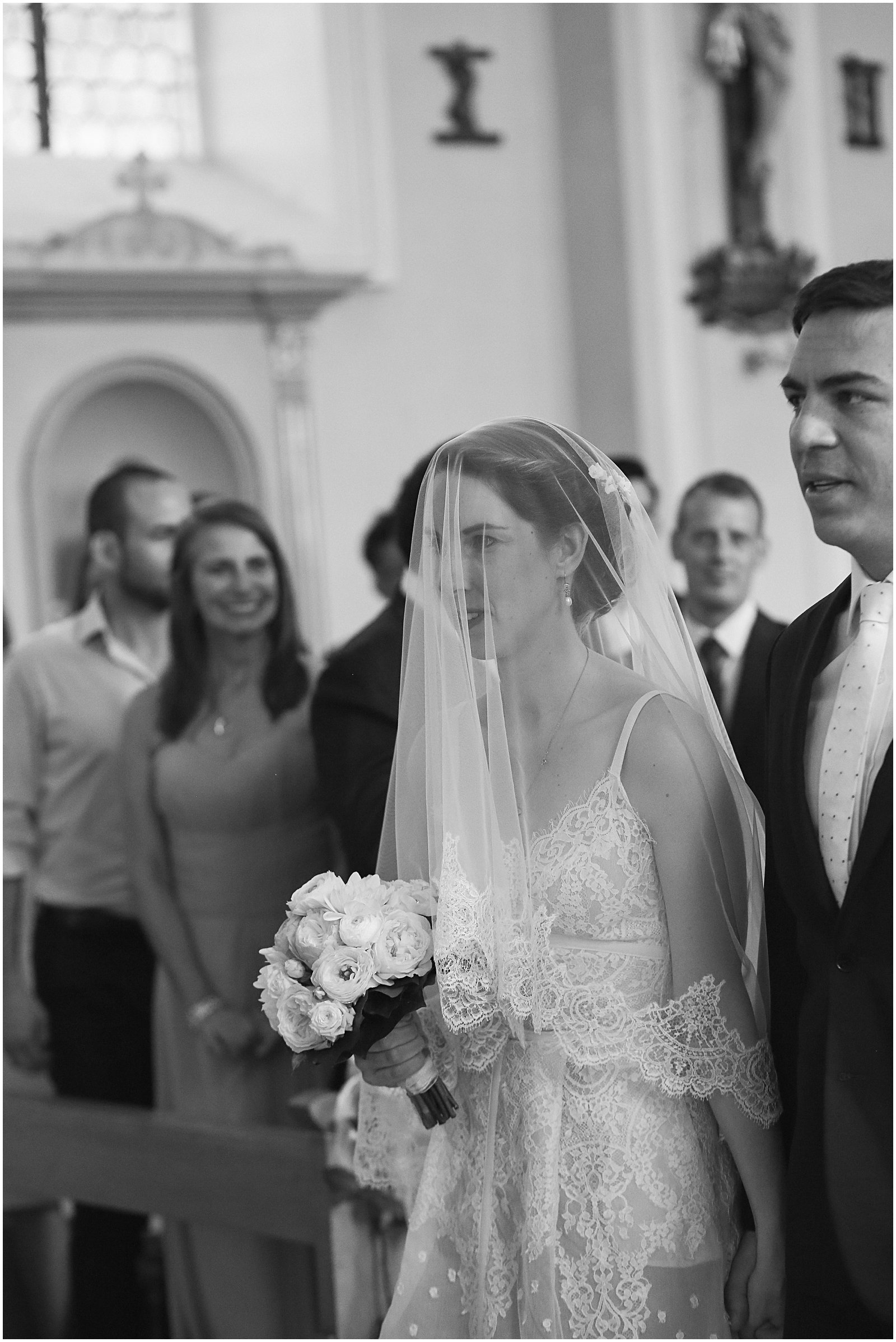 I arrived with my wedding assistant (ahem: studio manager…and husband) to the most beautiful church (Saint Rémi) in the small French village of Wettolsheim, right outside of Colmar. Alex so graciously came along as my second shooter, and I’m so glad he did as we were able to get twice as many portraits of Keriann and Daniel walking down the aisle – and from above the church (such a great vantage point of the entire room)!