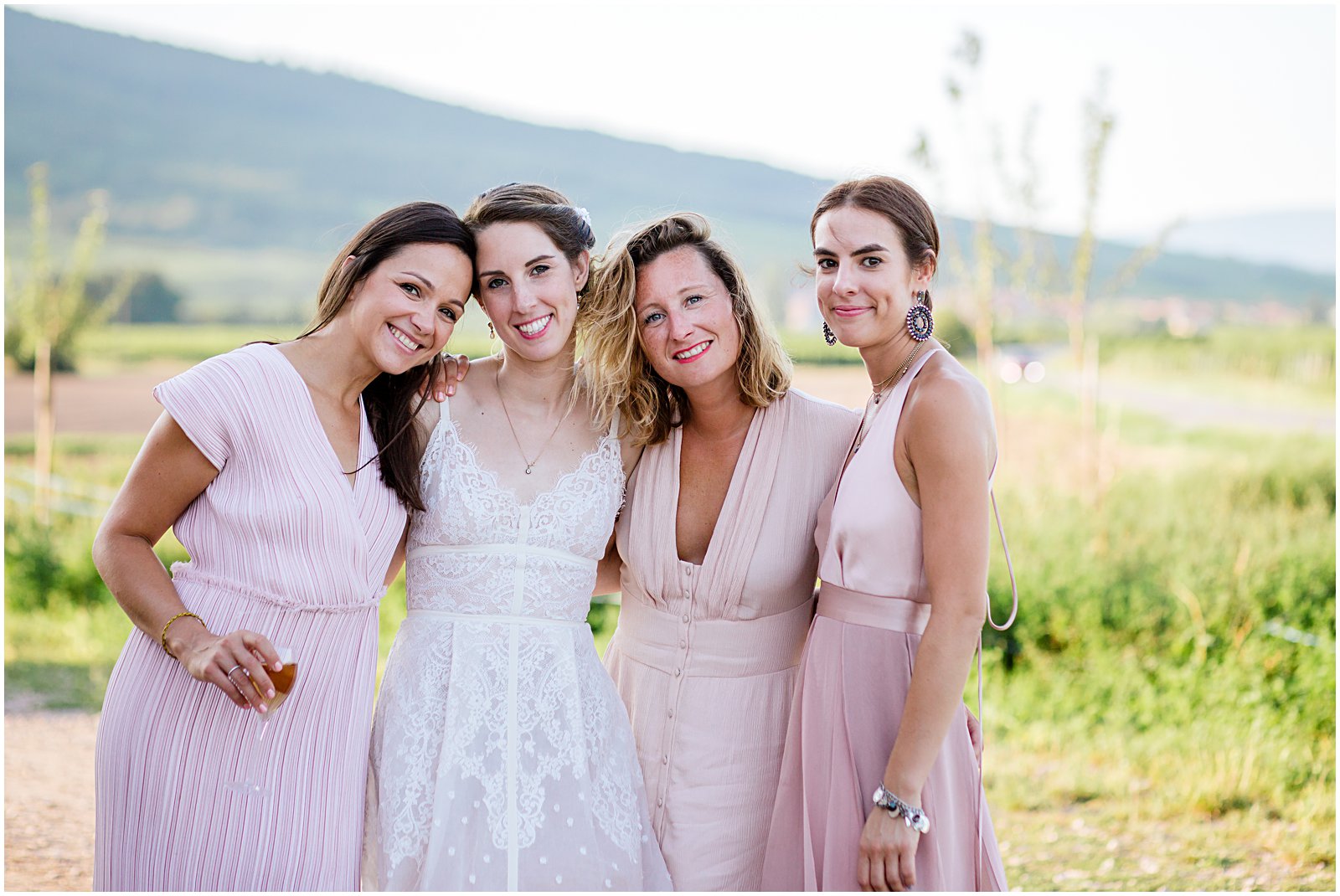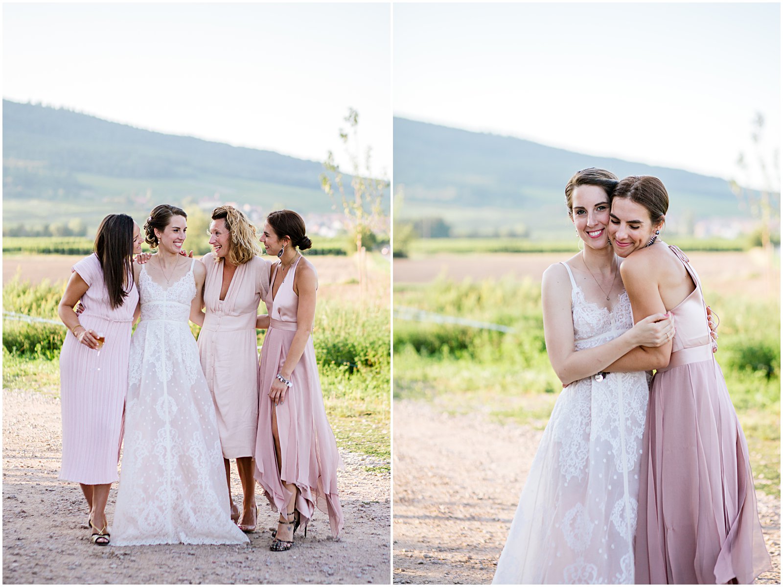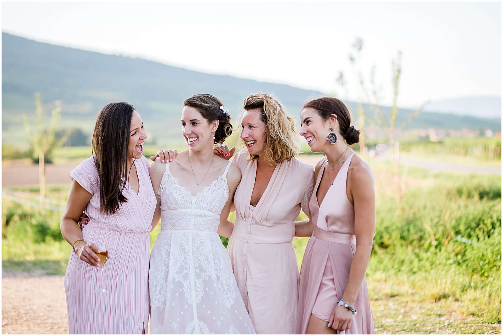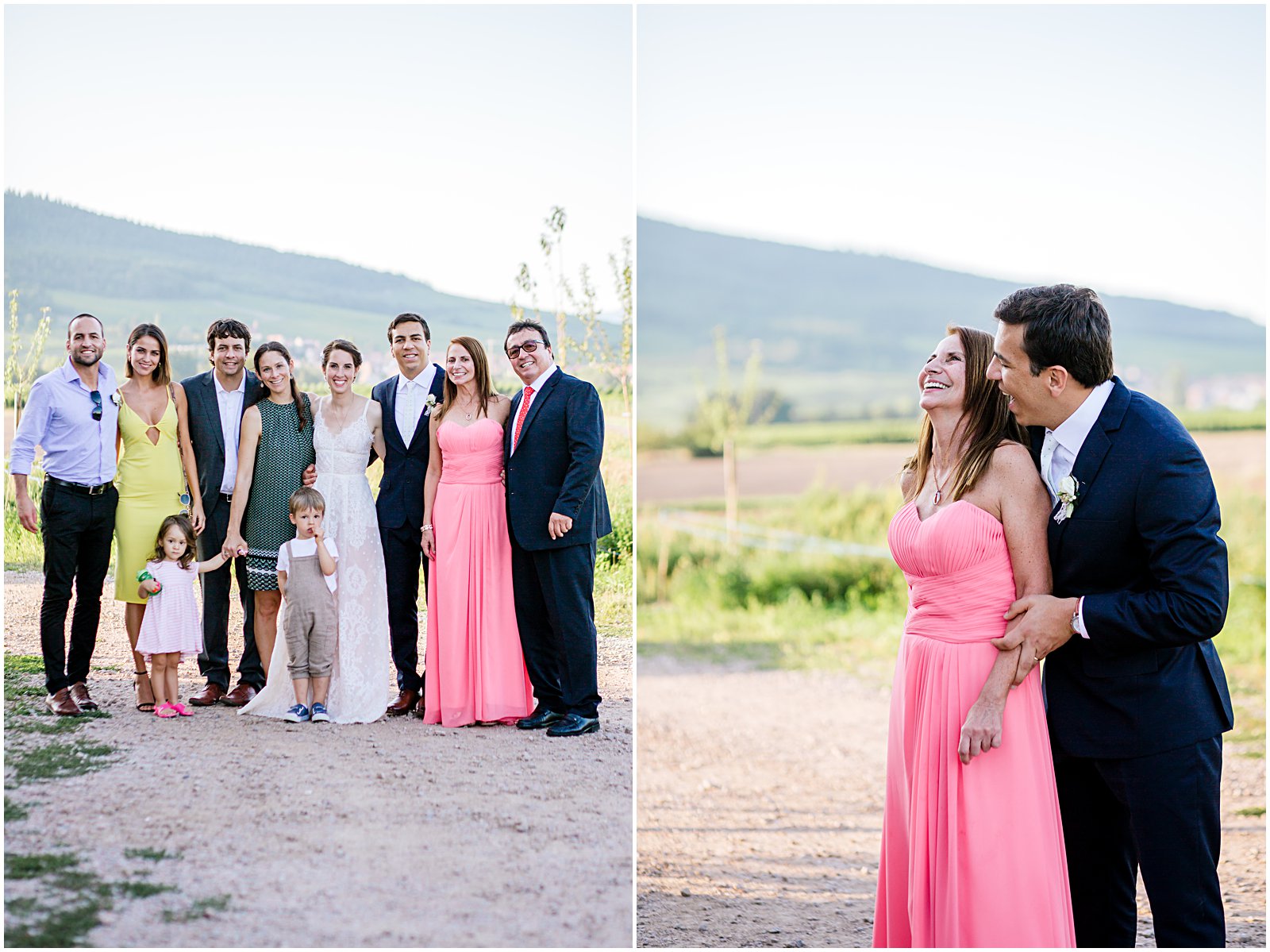 As golden hour began, I brought Keriann and Daniel to the open shade with the Alsacian mountains behind them, and while my assistant Alex distracted her 3 year old with some wildflowers, I documented some sweet, natural moments of the two of them and their friends.