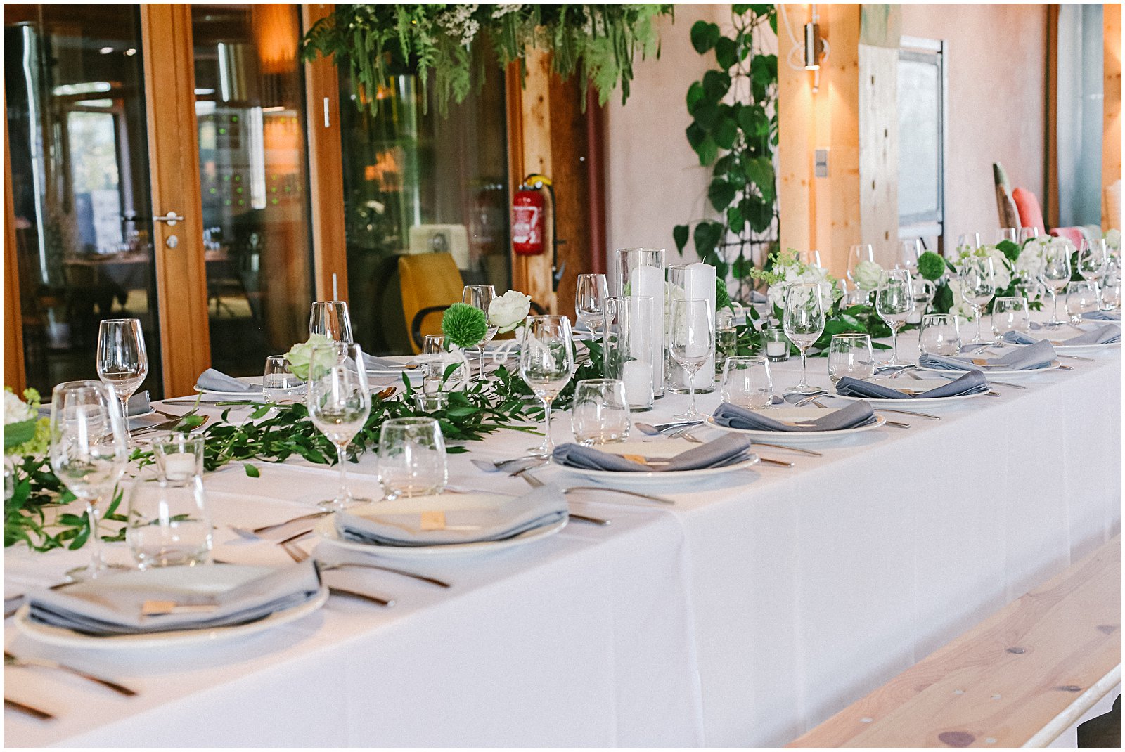 Upon entering the sophisticated Achillée winery, two long banquet tables and a wine bar welcomed the guests. To the right behind the decorated tables, the wine distillery was hidden behind glass doors.