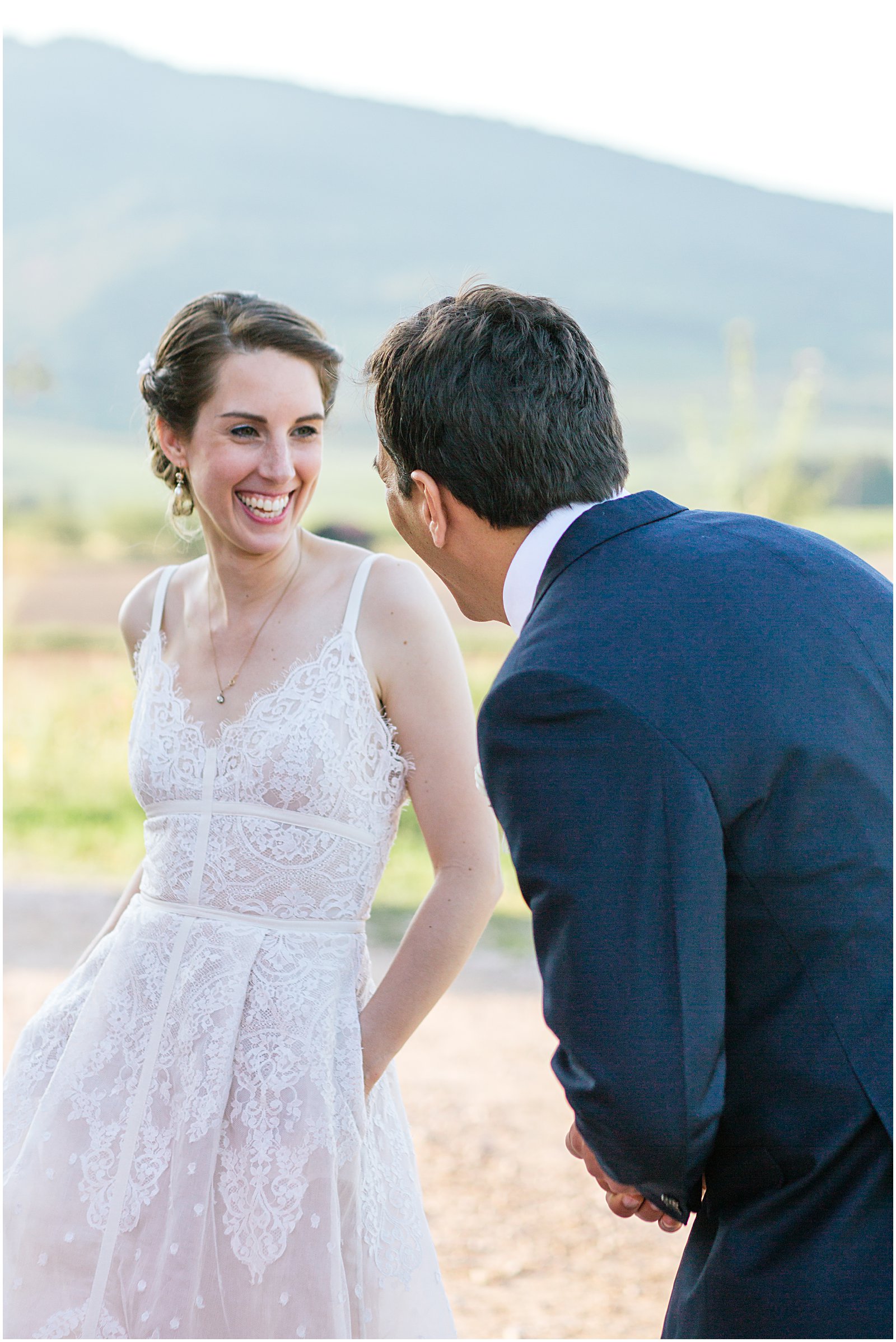 Keriann looked absolutely stunning in her delicate lace wedding gown and long-flowing veil. Flowers sprinkled her sophisticated updo, and she carried a lovely bouquet of white peonies. Daniel matched her in elegance and style with his dashing blue suit and peony boutonnière. They were so gorgeous!