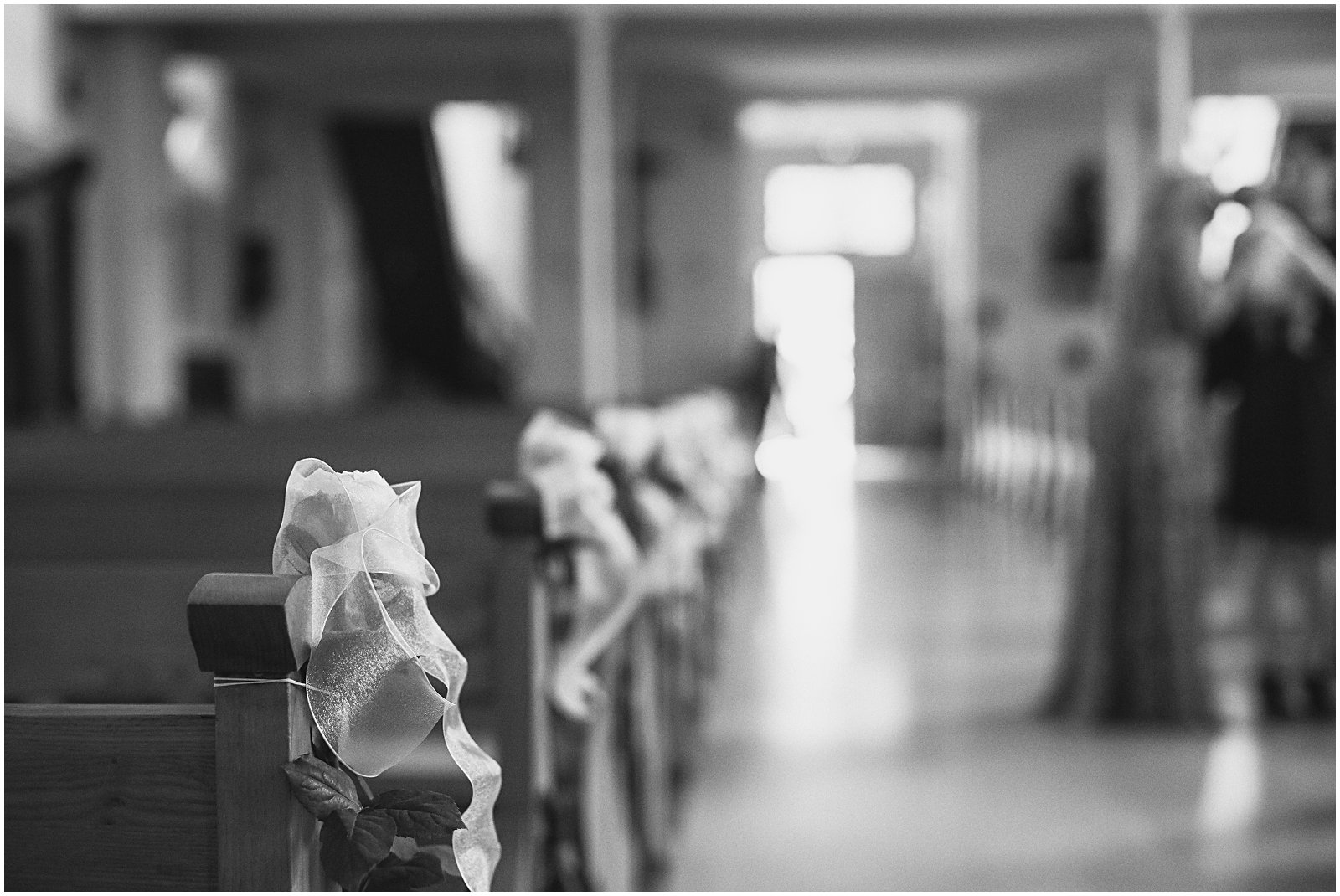 The ceremony glowed by candlelight and colorful stain-glass windows. Ribbon tulle roses lined the church pews and guests began to pile in and take their seats as the bride and groom walked down the aisle.