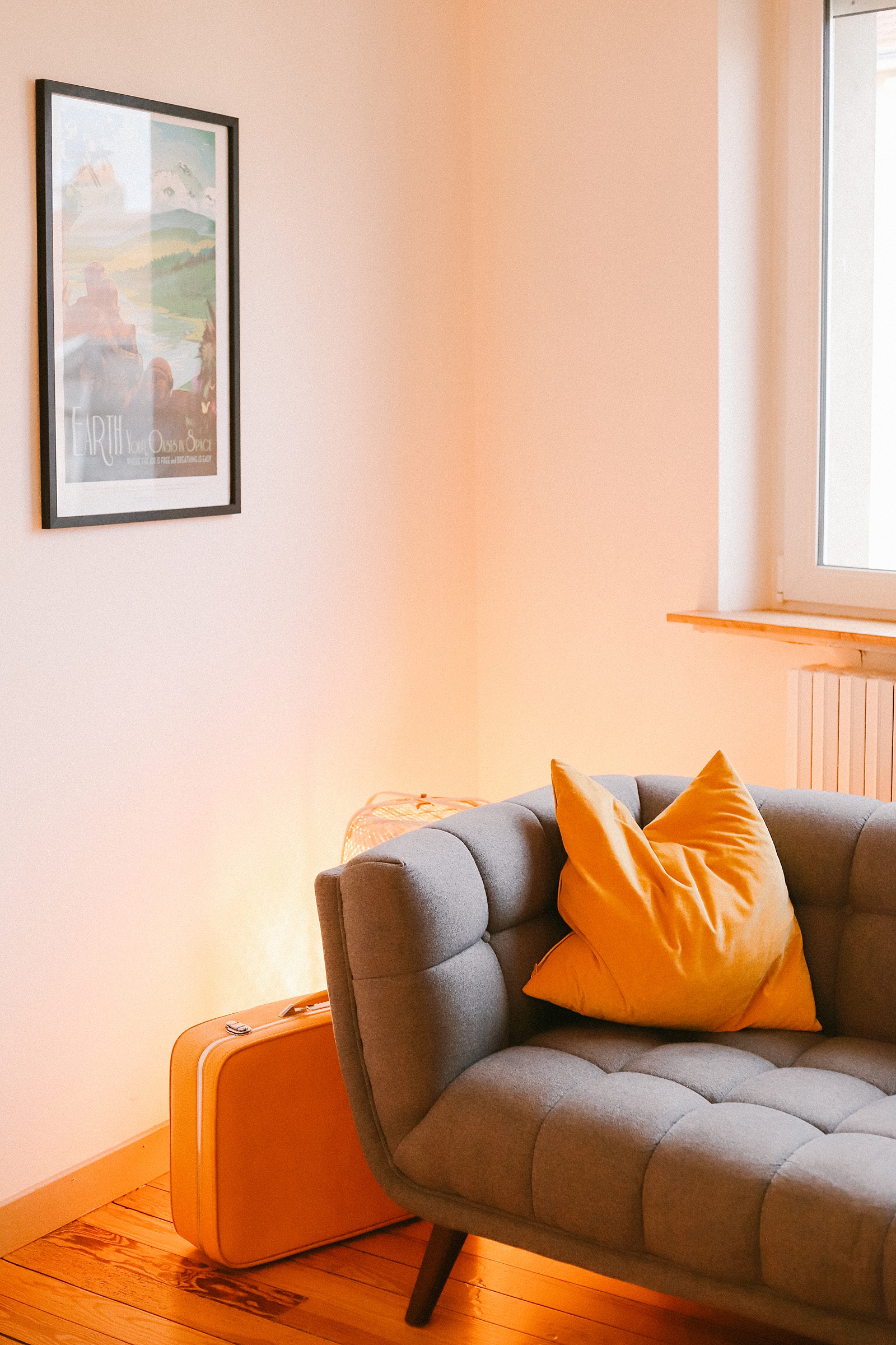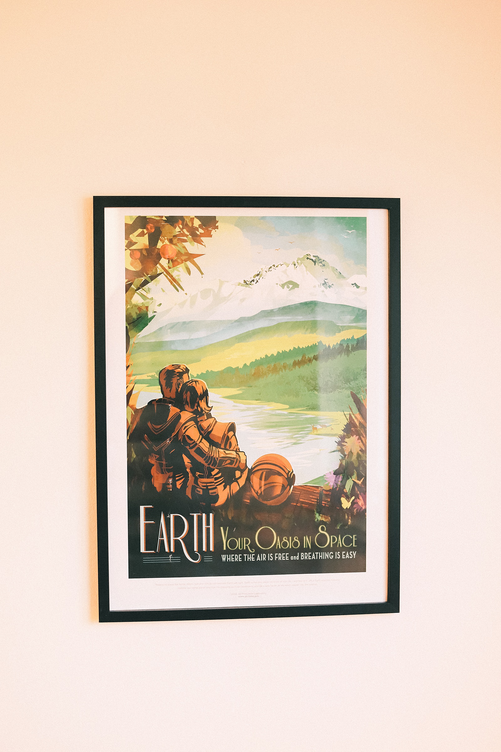 A vintage NASA poster hangs near the couch. Holding special meaning for us, it was the first item we purchased when we first moved to France after getting married in 2018. In it, an astronaut couple sit embraced as they look over the lush greenery of planet earth. It’s one of our favorite possessions we own and we’ve hung it up in all of our apartments. You may remember it from our first apartment tour blog post here!