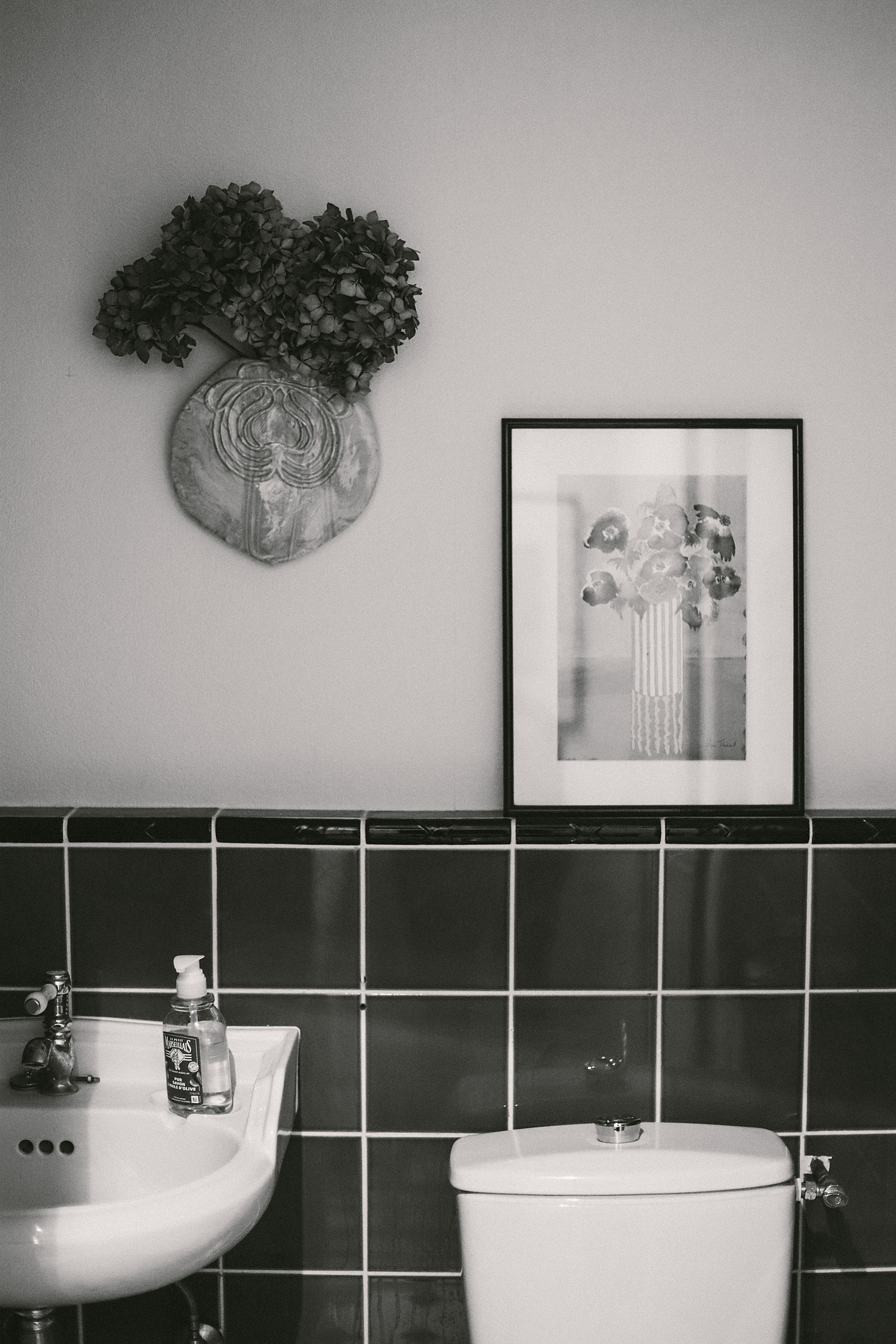 The bedroom is lit by candlelight every evening, huge closet space with sliding glass doors and my favorite books on my bedside table. I also included one of my favorite photographs from a local photographer in our last home we lived in – Guethary, France (near biaritz!) No clutter. Just spaciousness and clarity.