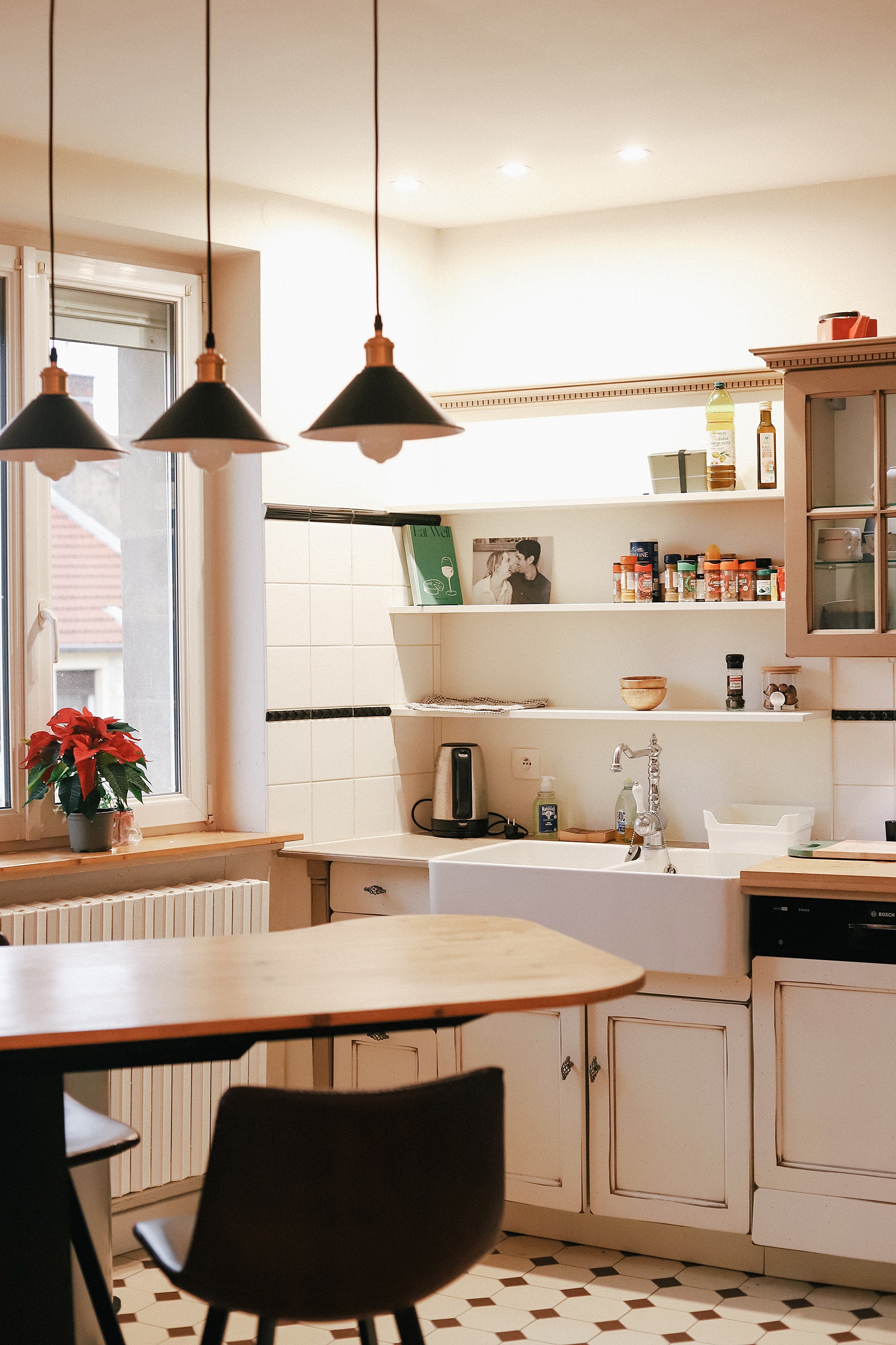 Alex is the chef of the house, so he is often found here cooking and working at the table in the kitchen. I love the openness of this kitchen and how it looks over the living room – which is such a rare find for most apartments in France.