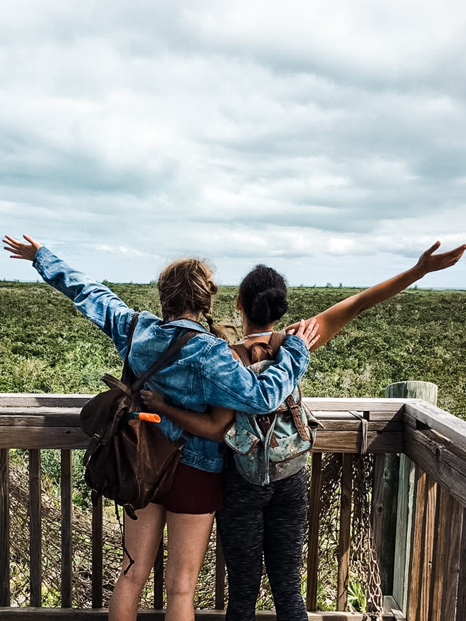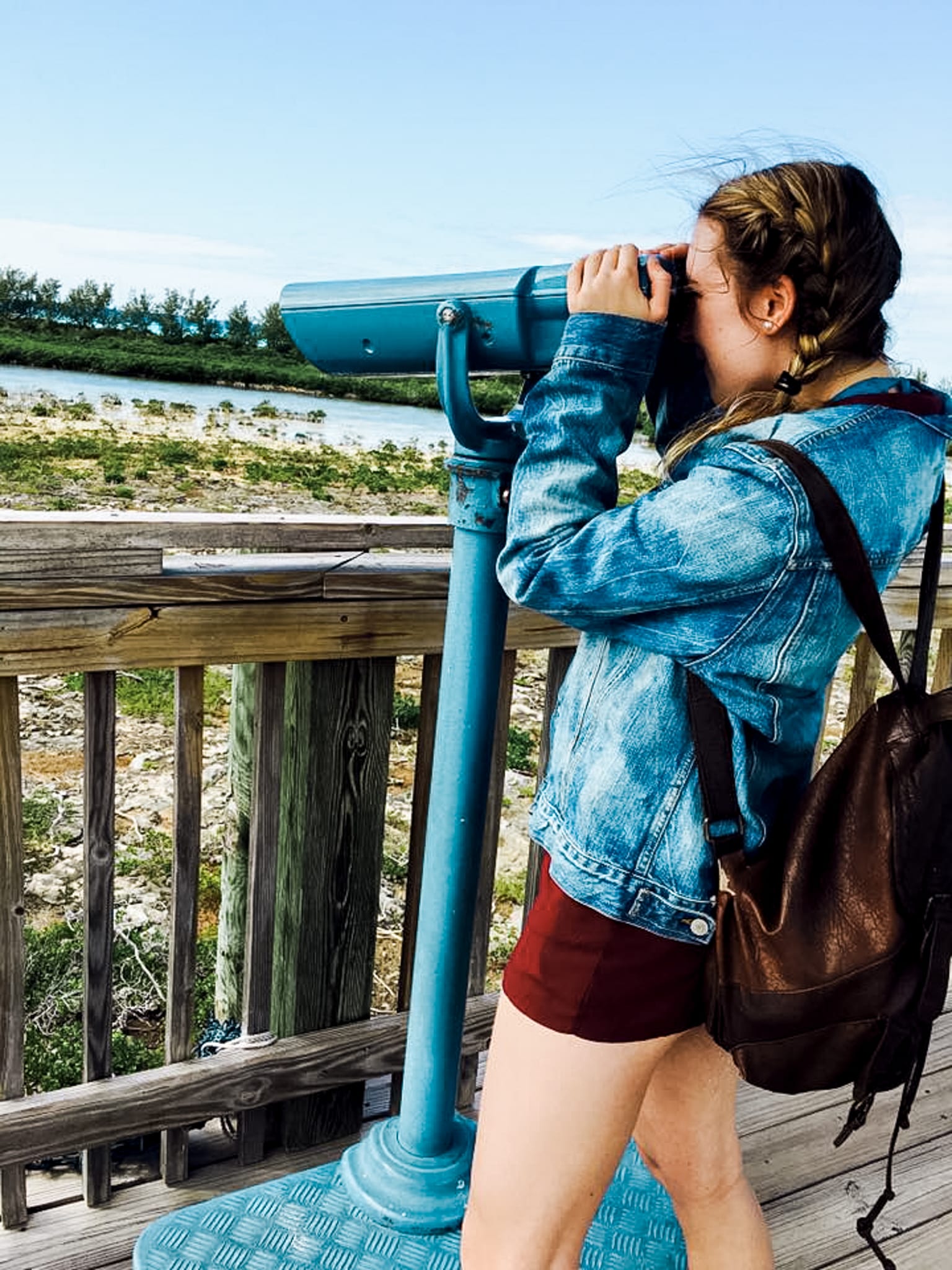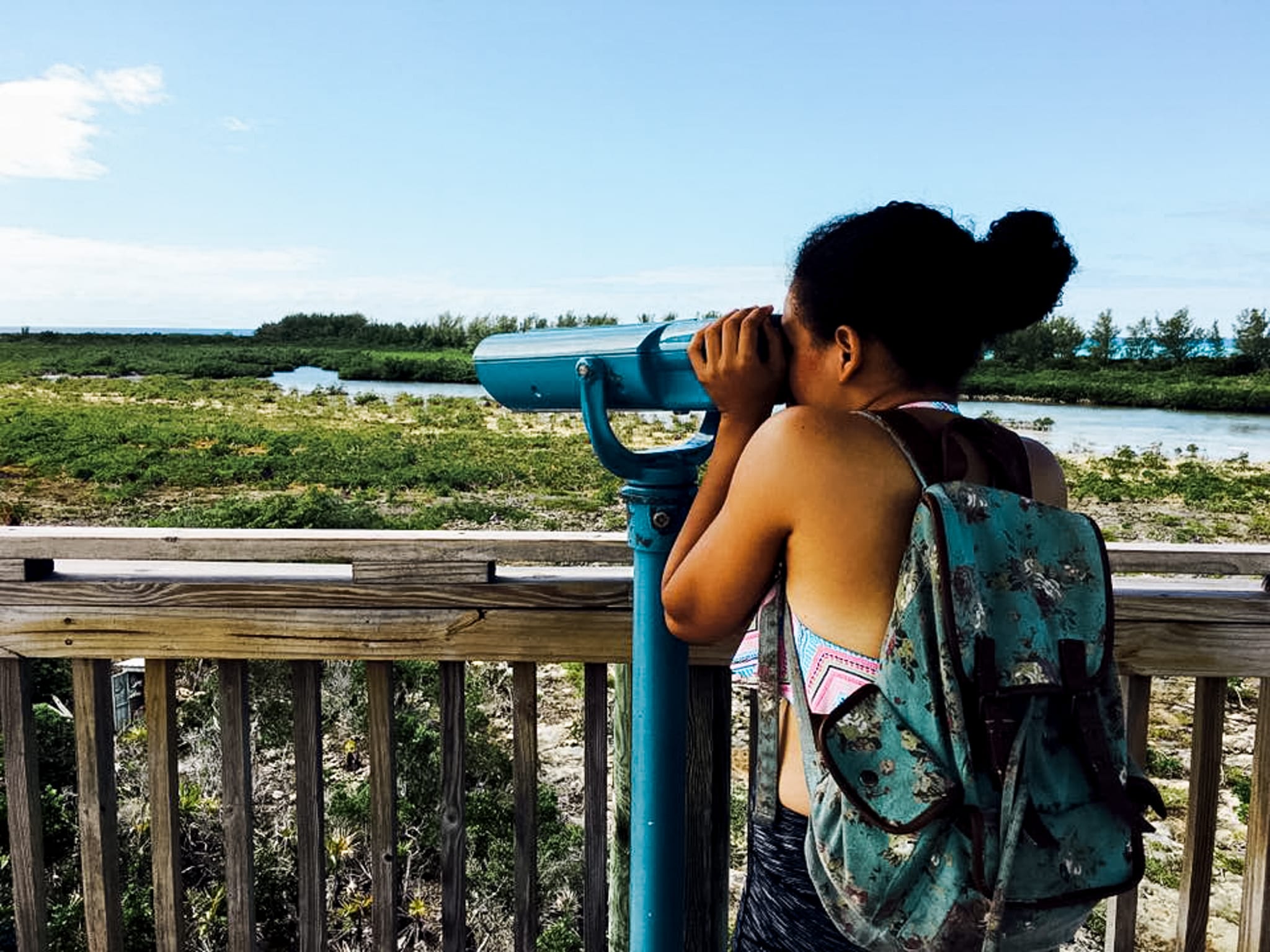 With very few people exploring this high up look-out point, we climbed up the stairs and saw these green, lush views of the vegetation on the island. Stillness. Absolute stillness. We stared out in awe and took in the warm breeze. With FREE telescopes (yep, that’s right, you don’t have to put in a quarter to see the view!), we observed the plants and flowers before heading out back to the bike trail.