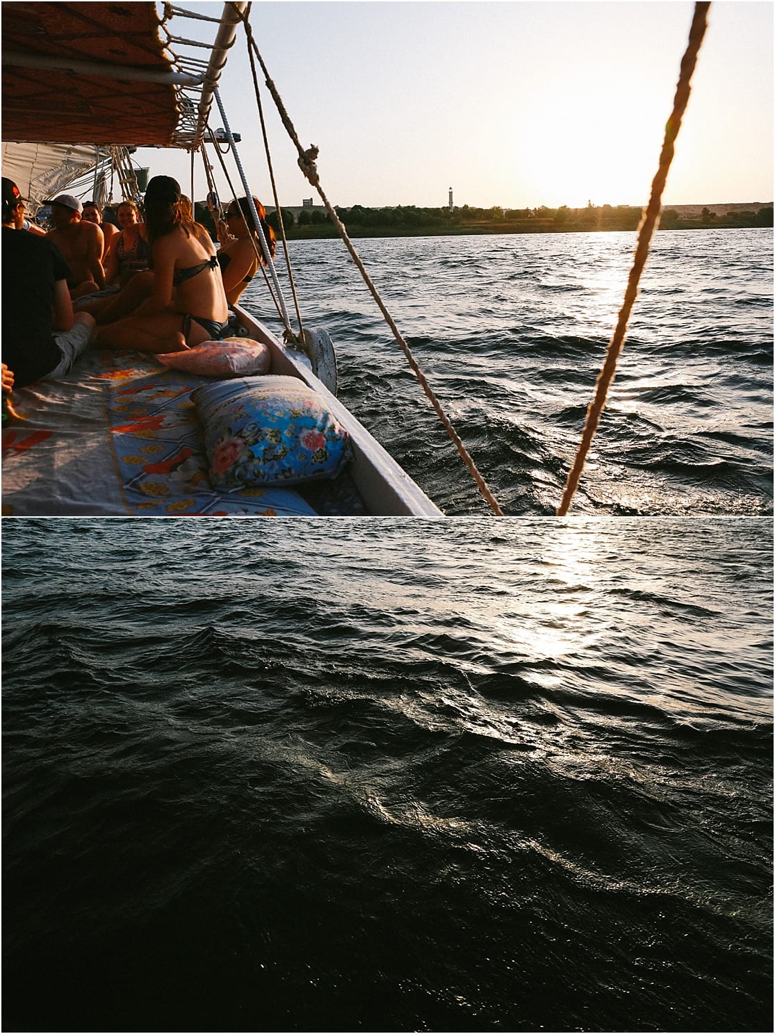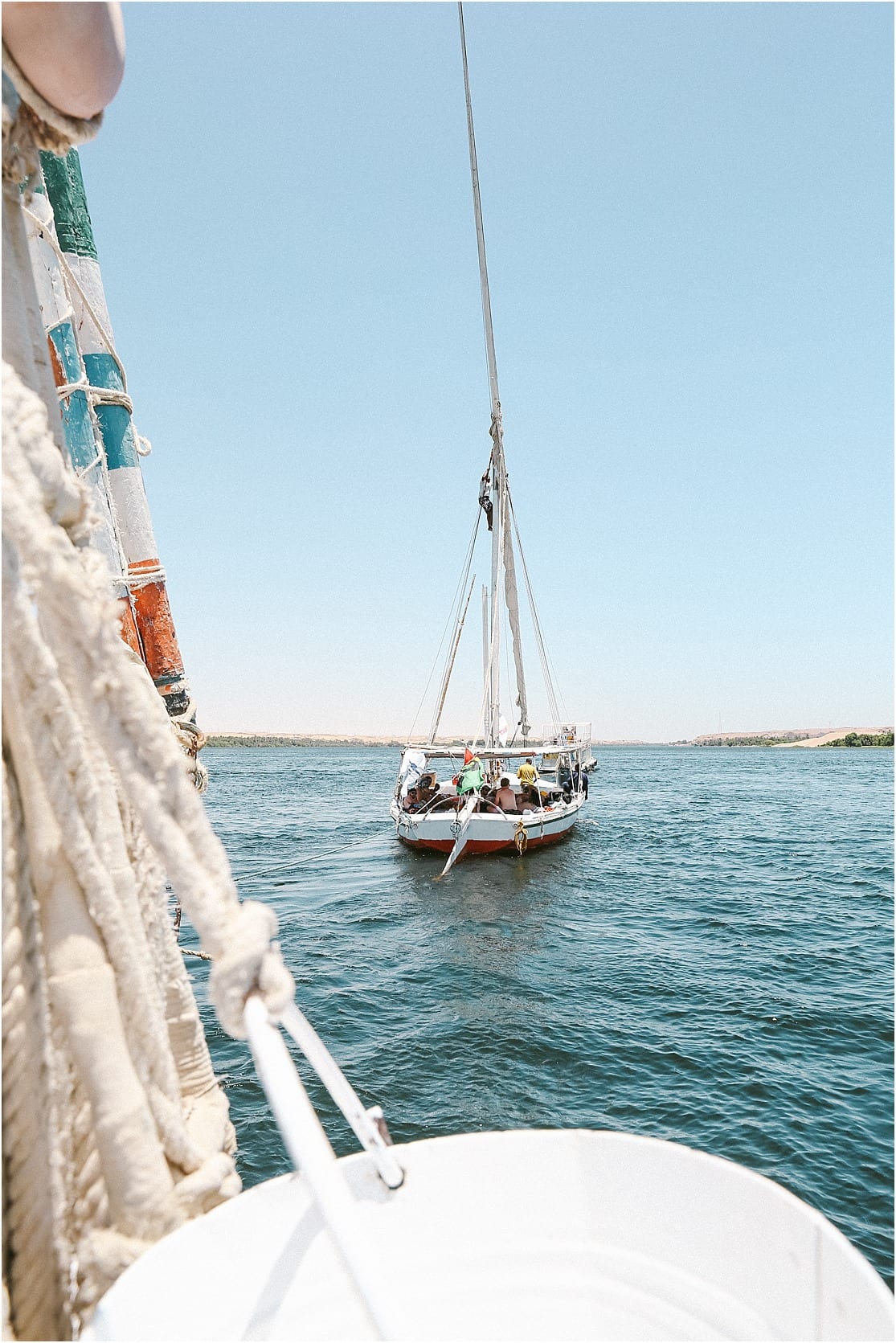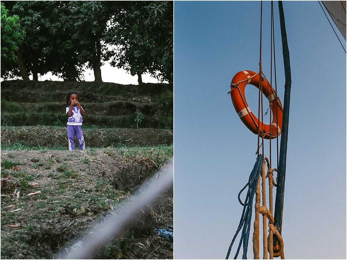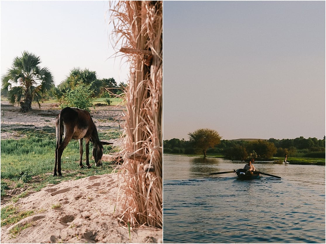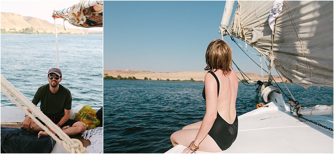 My absolute favorite moment during our 3 days sailing along the water was one particular instance when Alex and I relaxed on the front deck of the sailboat chatting, dipping our toes in the refreshing waters and looking out towards the colorful horizon. Vibrant orange sand hills and lush palm trees lined the shores. Donkeys and camels and herds of sheep flooded the land, and there was always something interesting to notice. I’m glad I voiced my desire to do this to our tour guide, Sam, as we never would have been able to sail: our captain crashed our felucca boat into a massive metal pier earlier that morning and our sail and anchors were now broken. But later in the afternoon as the sun was started to decline in the horizon, I mentioned to Sam if we were still planning to sail instead of just floating at a standstill alongside the loud engine from the “poo boat” (yes, that’s right: we had a boat dedicated for poo.) and he readied the sails on the first Felucca so we could have some sailing time. It was the most beautiful experience I had on those few days aboard, and it was our first time ever sailing. We loved it so much, Alex and I are considering to take a sailing class someday!