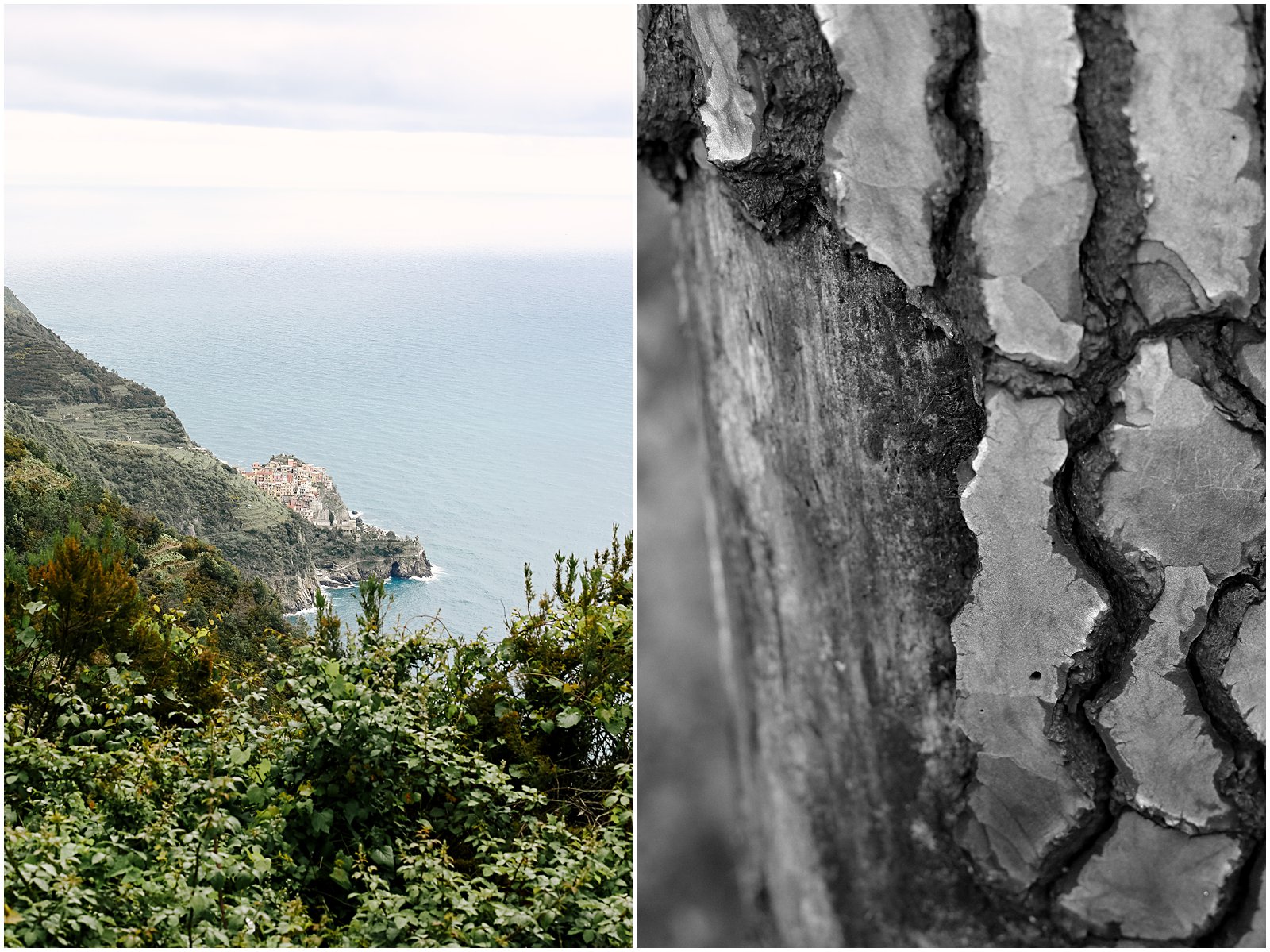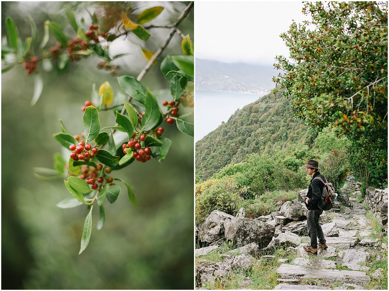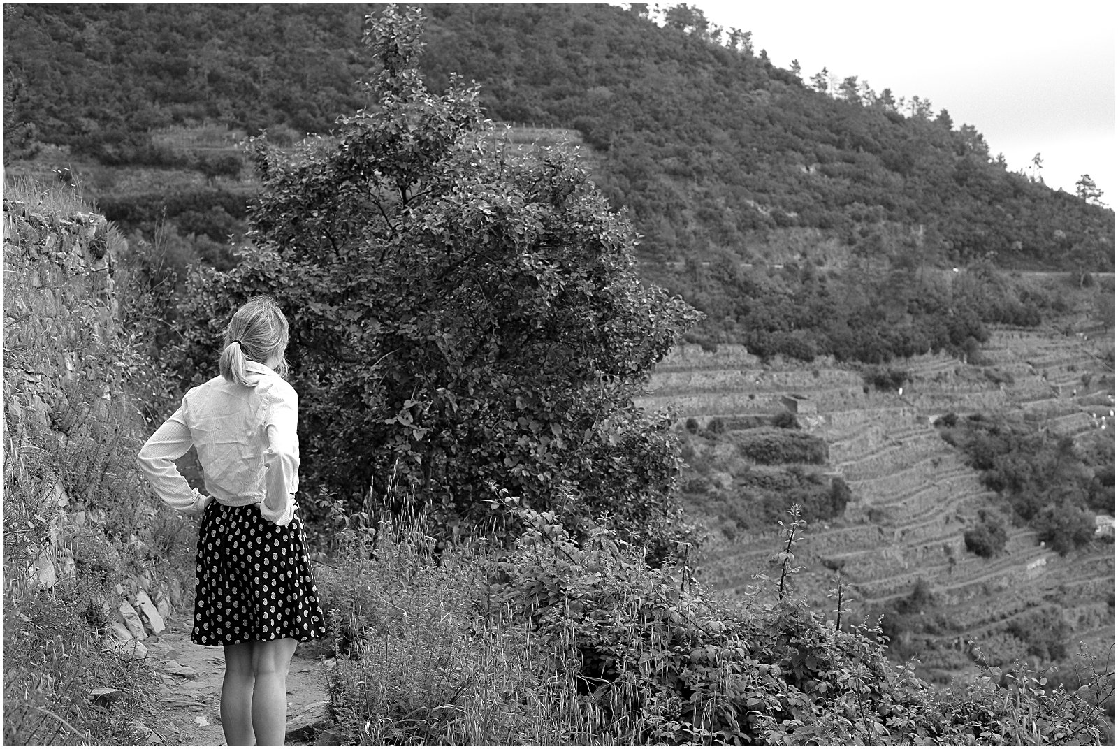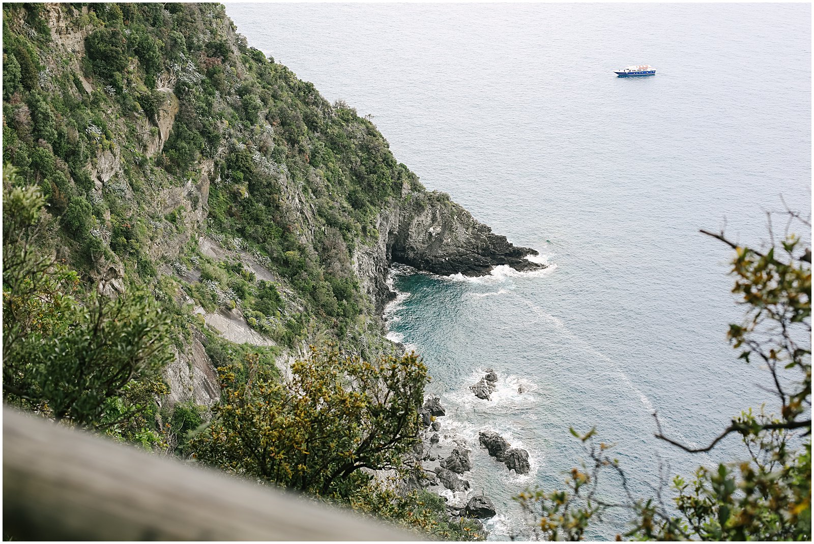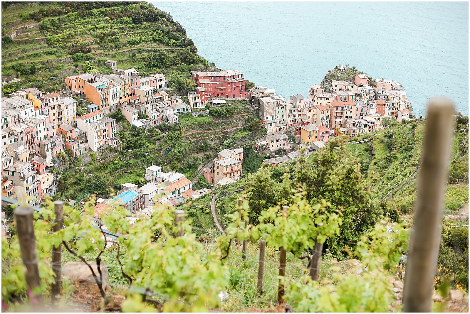 The red trail was our favorite trail, as it was far more challenging than the cliff-side blue trail that hugs the sea below. The red trail took us up deep into the lush mountains, with its spattering of yellow wildflowers and green mossy leaves along the far off mountains. The dirt-path climb was steep and challenging, and we encountered the most awe-inspiring views of the vineyards leading down to the village of Manarola. The trail from Corniglia to Manarola was long, taking 4 hours to hike up, through and around the forest.
