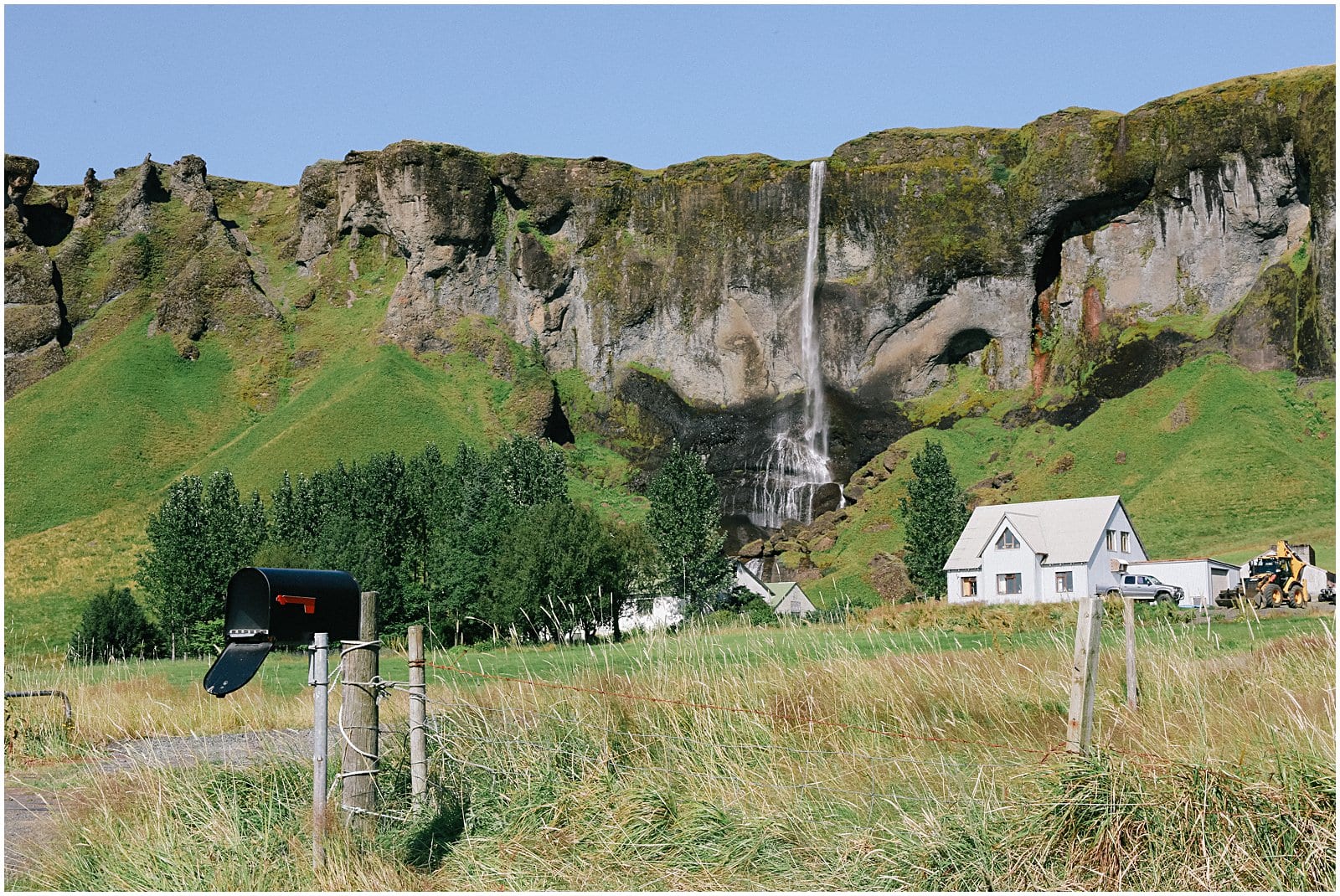 10 minutes later, along Route 1, we encountered the 62m high Skógafoss waterfall towering over a rocky cliff at the western edge of Skógar. Dramatic, windy and surrounded by soaring birds, we climbed the steep staircase along the falls to witness a magical view of the countryside and a pack of sheep (always in 3!) drinking the fresh Icelandic water.