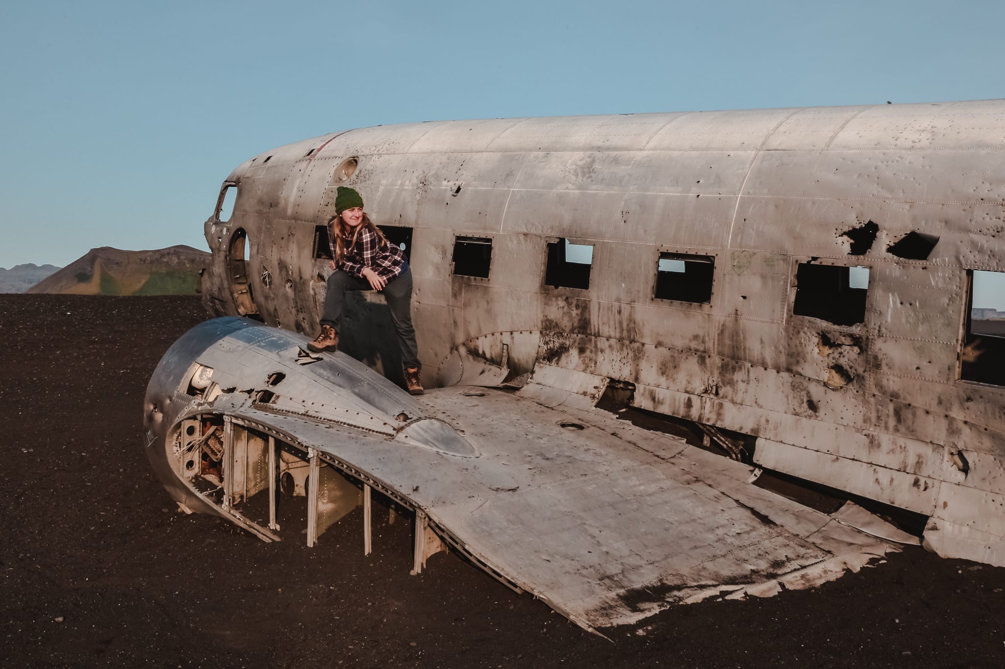 Back in 1973 a United States Navy pilot ran out of fuel and crashed on the black beach at Sólheimasandur. Luckily, everyone on that plane survived, but the remains are still located along the sand. There was no sign on the road to point out where to turn and the plane cannot be seen from the road, but we noticed a parking lot with a bunch of cars parked and figured that’s where we’d find it. Alex and I arrived at the wreck at golden hour, which was perfect, because the lighting magically lit up the plane and there were less crowds!
