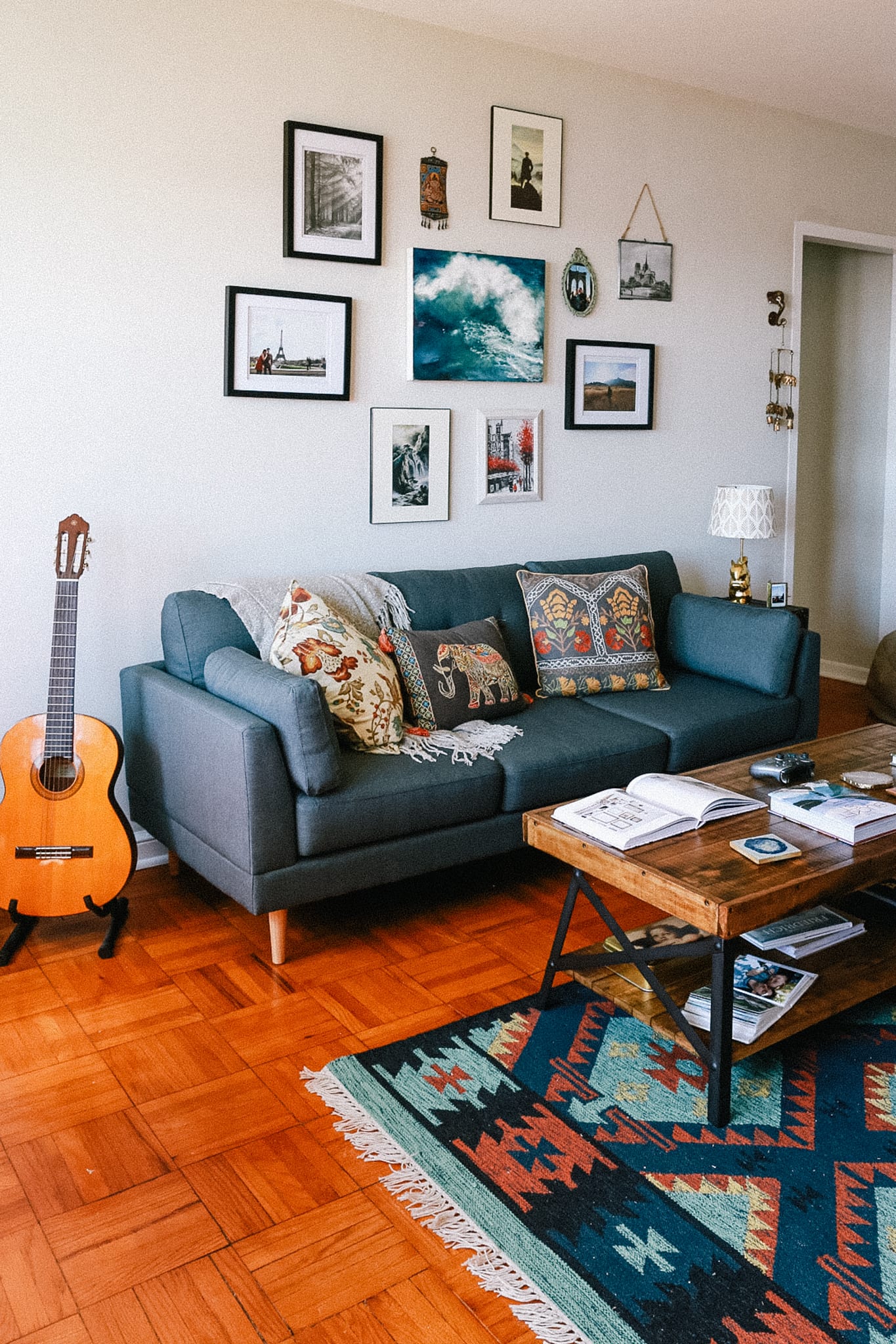 But we did combine our record collections, we combined DVDs and board games and coffee table books. We compromised. My love for a minimalist, Scandinavian design was put aside and his love for dark reds, blacks and cherry wood furniture was also questionable for my taste. We met in the middle, deciding on a mutual love for odd, eclectic, colorful, and warm touches. We met together on our passion for travel, music, entertainment, and studying. Art books on Picasso, Monet, impressionism, and Mattese are scattered on the table along with countless travel guides, language books, and travel-related items. All things that bring us joy. Most items are useful – my love for keeping things only that are of purpose is central to our home – but our agreement to keep treasures that make us smile and reminisce upon looking at them was also paramount. Our photo albums of our past 3 years adventuring together sit near the couch, open and available to glance at always. Photos of us gleaming in picture frames and polaroids hanging in our bedroom from our latest trips. My black and white film prints hang throughout the house along with polaroids and pictures from our latest travels. A stack of Travel & Leisure magazines sit in the bathroom, along with the vintage perfume bottles that are picked up and used daily. The Mickey Mouse toaster, the fox salt-and-pepper shakers, the elephant hook from a local market in Bali, a painting from a friend. Trinkets – but trinkets that either bring joy or are useful. I love our home, this space that we’ve created and made our own.