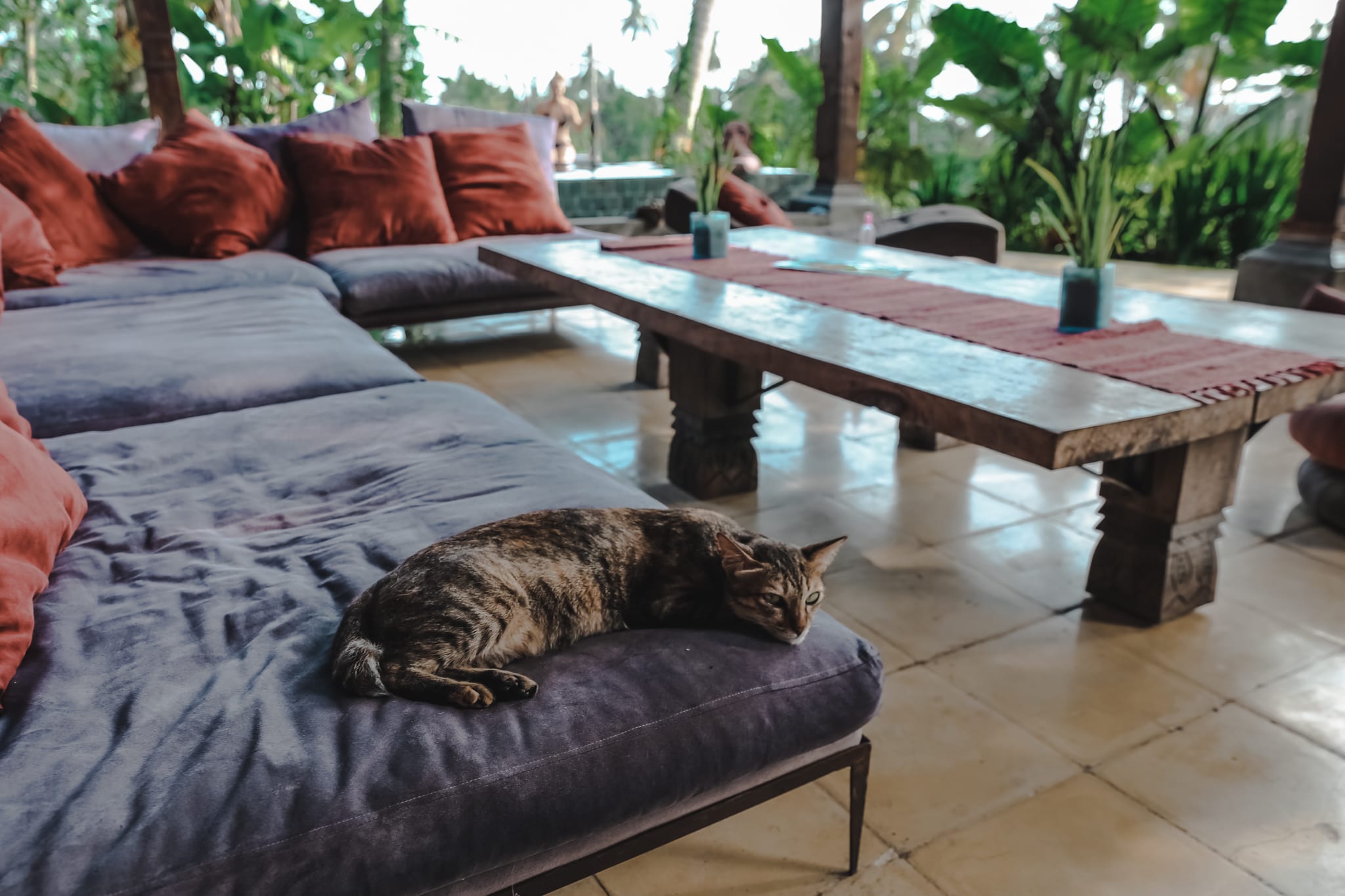 As soon as I arrived at the Birds Nest home-stay in Ubud, Bali, a skinny and striped young kitty with only a little stump as a tail pounced on my lap as I was checking into my nest (yes, I lived in an actual woven nest 4 floors off the ground) meowing and kneading her paws onto my skin. Let’s be honest: you can never tell with cats; most of them are complete assholes, swiping their claws at you with the flick of a switch and always independently swishing their tails at you as they walk away. But this cat was an exception. She was an intensely affectionate young cat, constantly chatting with every person who walked in the room. She meowed so much, it almost became annoying (and this is coming from a huge animal lover). I learned from the Balinese men that worked at the Bird’s Nest that they found her homeless in the rice fields, and her constant meowing was so obvious, they decided to name her the sound she consistently produced: “Meow”.