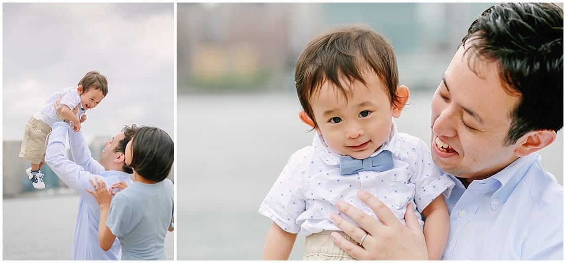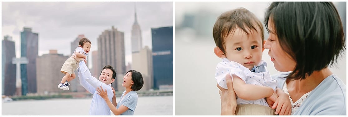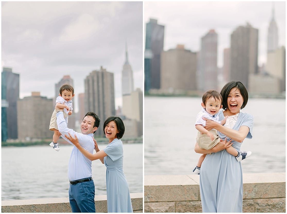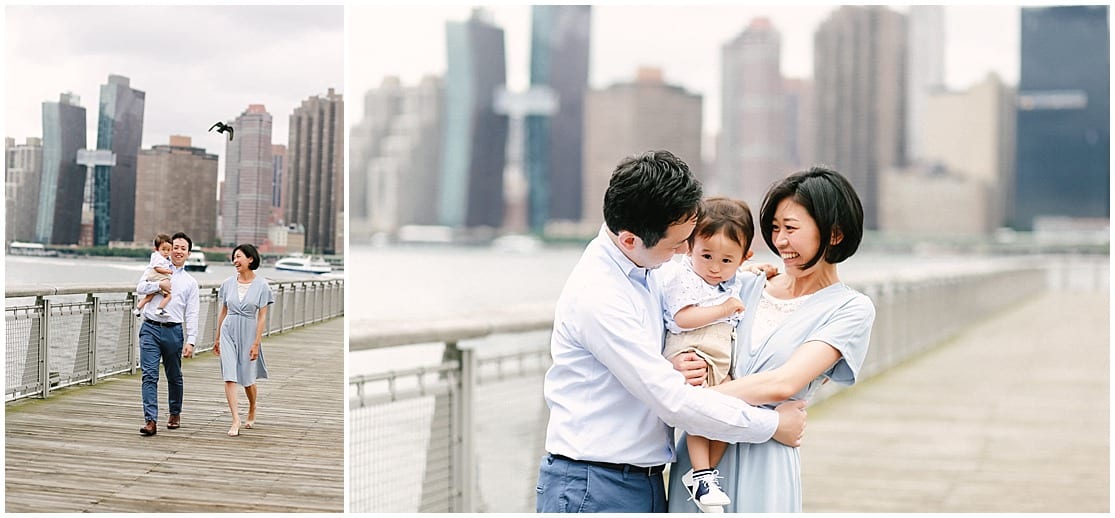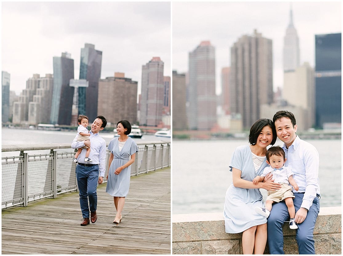 Yuki and his family reached out to me for some spring portraits near their home in Long Island City. I had photographed several of their friend’s families, and when they saw their prints in their friends home – they knew they had to document and record their precious family with Manhattan’s skyline as their setting. It was decided: Gantry Plaza State Park. A crowd favorite among the families in New York and one of my favorite places to photograph. With the glistening skyscrapers of the Upper East Side, the United Nations, and the stretch of pier leading out on the Hudson, combined with their timeless and classy outfits and their charmingly adorable 10 month old in tow, they pulled up with the stroller and we went out on our adventure.