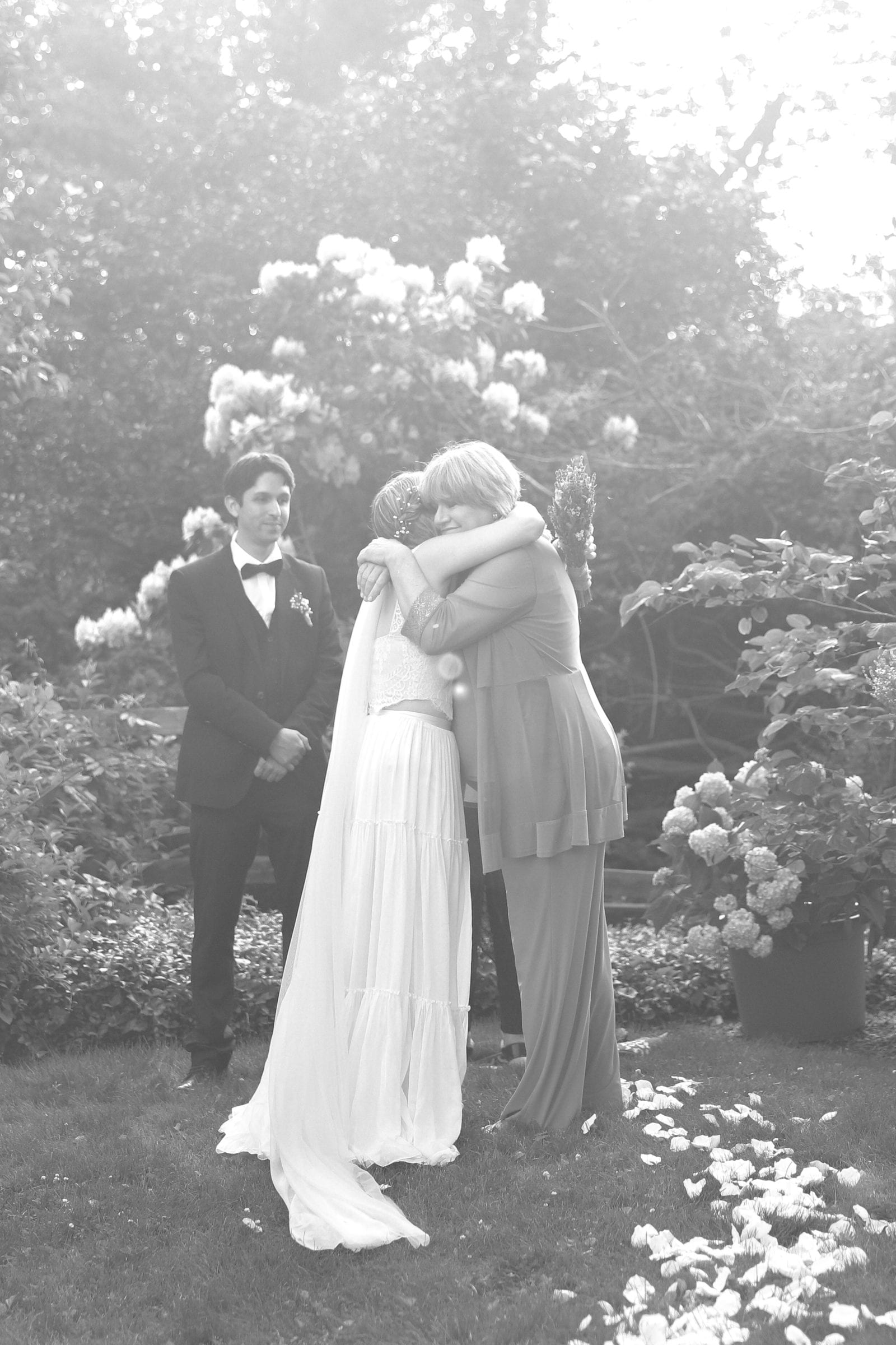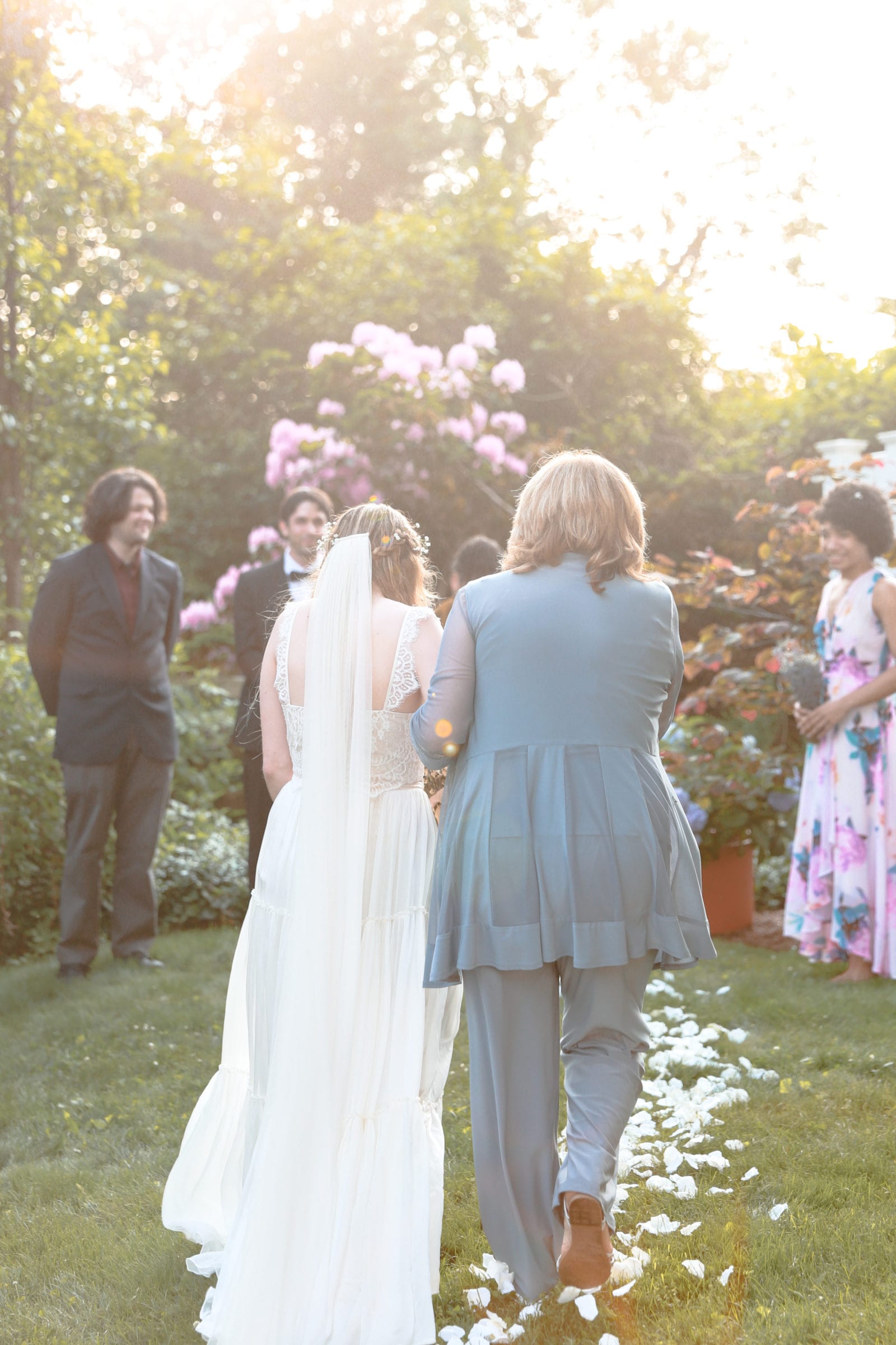 Our ceremony was on the lush grass in my husband’s parents’ small but charming backyard, surrounded by blue and purple Hydrangeas and the soft golden rays of sunlight. Flowers were plentiful and white flower petals were sprinkled to the “altar.” I was barefoot and held a dried lavender bundle, as my mother walked me down the aisle. Red cardinals were heard chirping, and the mosquitos were everywhere. And it felt utterly magical and perfect.