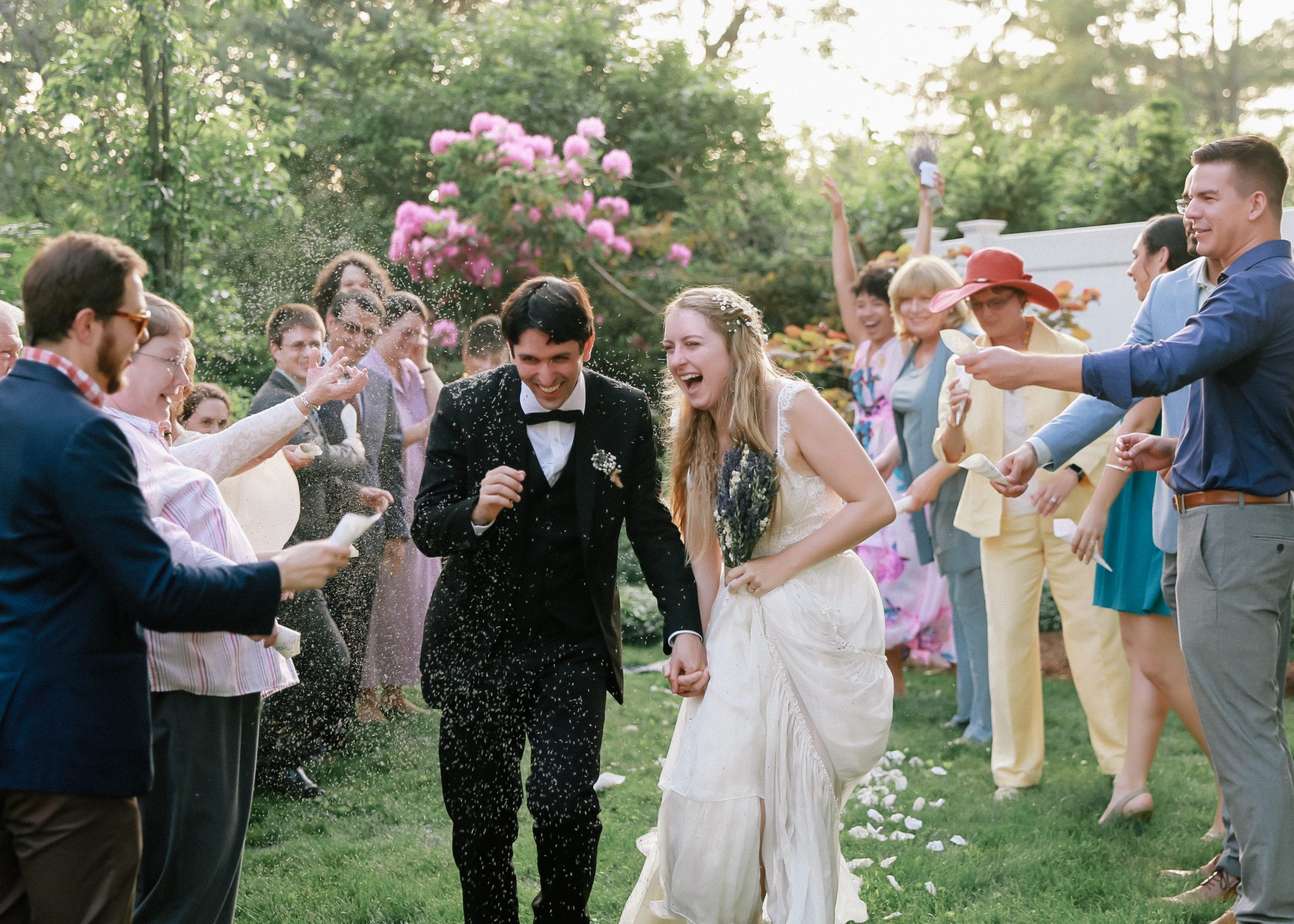Everyone was given sheet music cones filled with bits of lavender petals (Etsy was a literal godsend during our wedding planning) before the ceremony and after sealing our union with a kiss, we ran through our crowd of loved ones as everyone threw the petals at us. Our friend Simon even flew his drone around us! Technology these days, am I right?!