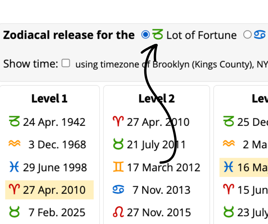 You can read your ZR periods for free on Astro.com! Personally, I love using Astro Gold software for looking at transits, synastry as well as annual profections and zodiacal releasing periods, but to find your for free, you can do the following: